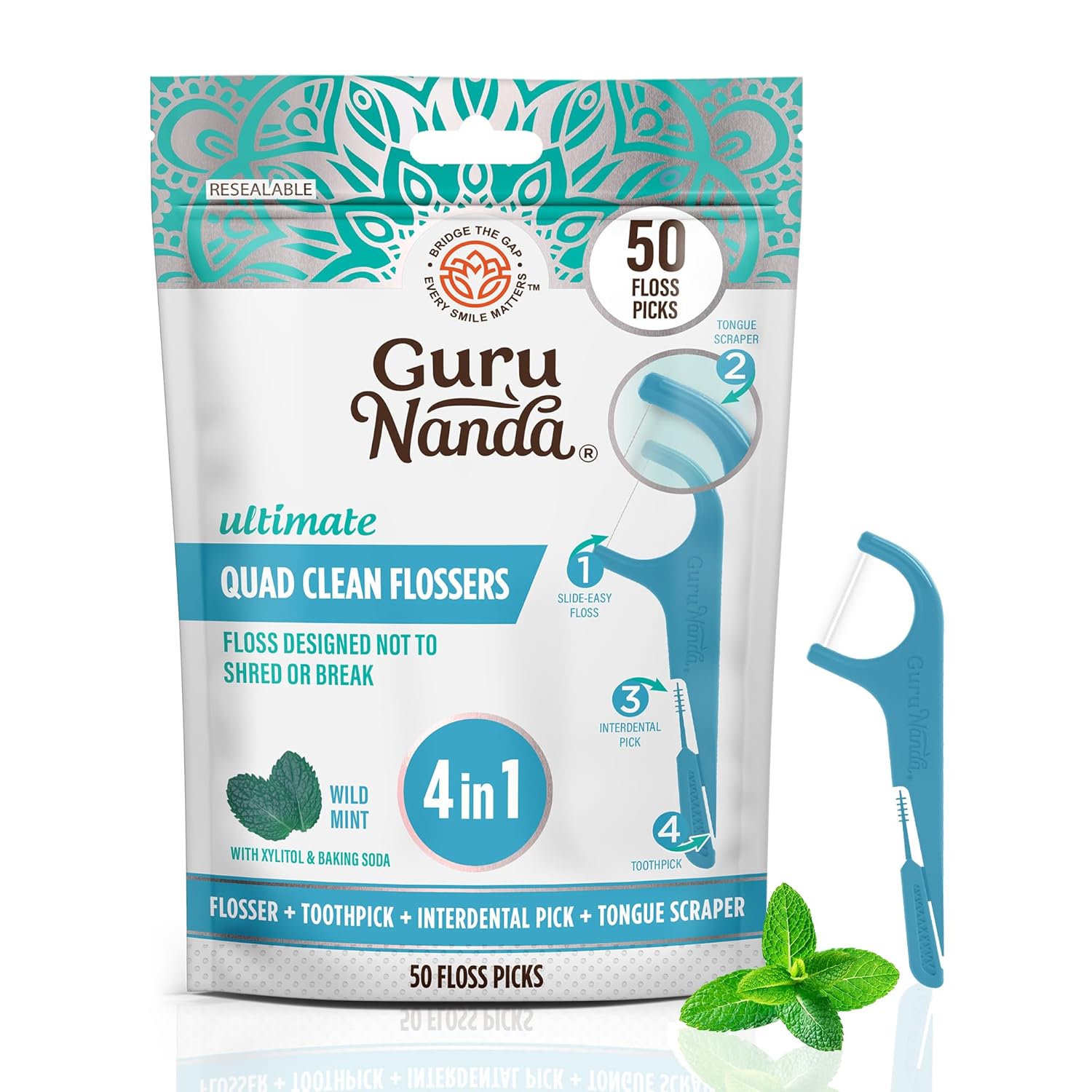 GuruNanda Quad Clean Floss Picks 4-in-1 with Tongue Scraper, Interdental Pik & Toothpick, Non-Shred Dyneema Thread, with Xylitol & Baking Soda, 50ct