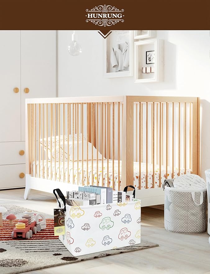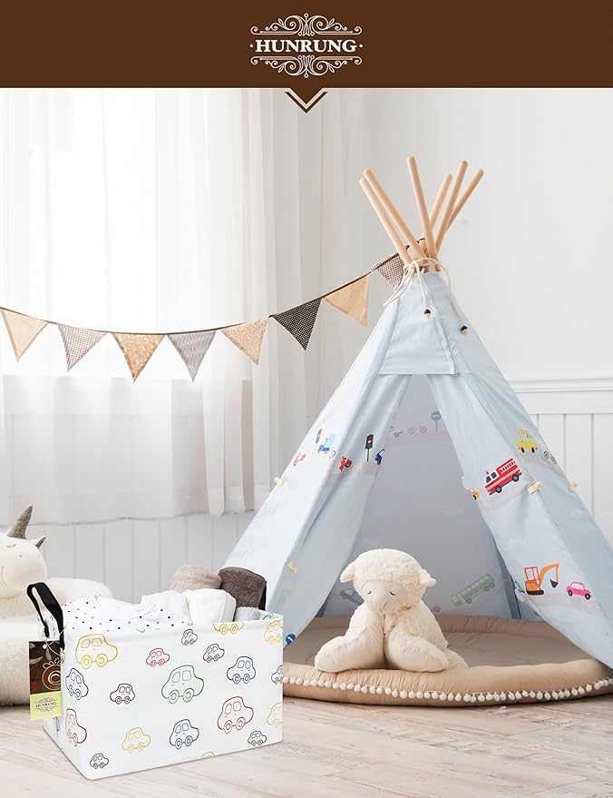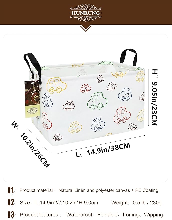 HUNRUNG Rectangle Storage Basket Cute Canvas Organizer Bin for Pet/Children Toys, Books, Clothes Perfect for Rooms/Playroom(REC-Car)