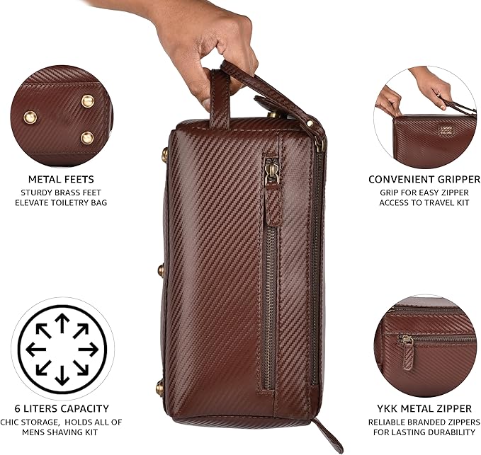 - Premium Carbon Genuine Leather Craftsmanship: Designed with luxurious carbon fiber genuine leather, this travel toiletry bag offers unmatched durability and style. The cherry brown finish adds a sophisticated touch, making it an elegant accessory for both men and women. Its premium material ensures a long-lasting, wear-resistant performance.
