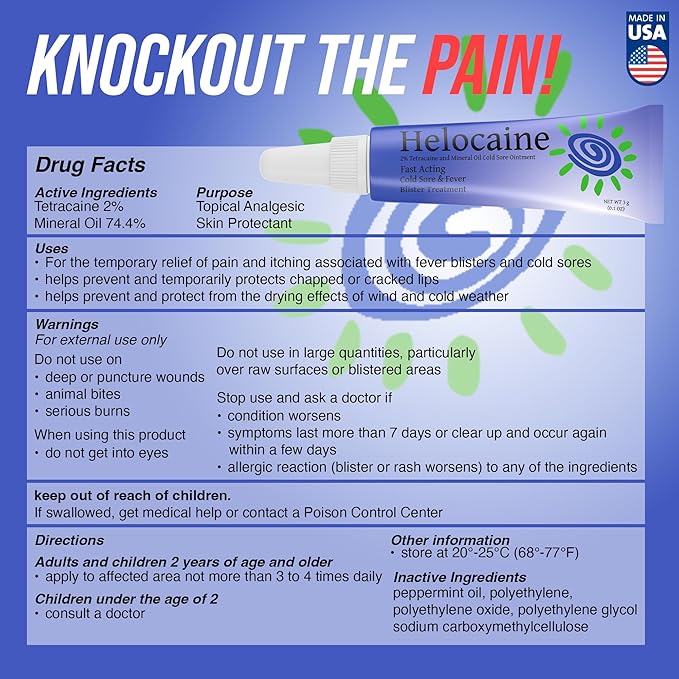 - Rapid Pain Relief: Helocaine quickly soothes the pain and itch of cold sores, canker sores, fever blisters, insect bites, and minor burns. Apply at first tingle for best results. Lasts up to 4 hours per application. Apply sparingly to sores inside the mouth. Safe for internal use as directed.