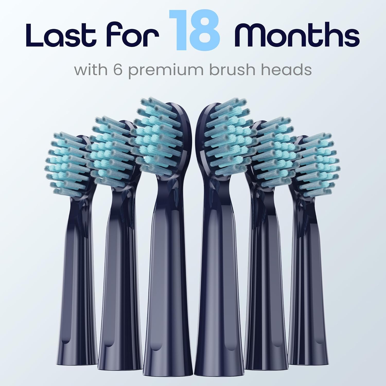 - PREMIUM QUALITY REPLACEMENT BRUSH HEADS:Made of high quality bristles and ergonomically designed to ensure deep cleaning of teeth and gentle care of gums, each set contains 6 brush heads, enough to support 18 months of use. No need to buy replacement brush heads frequently, save more time and money, each brush head is designed with an easy-to-replace connector for quick and easy installation, avoiding cumbersome operation.