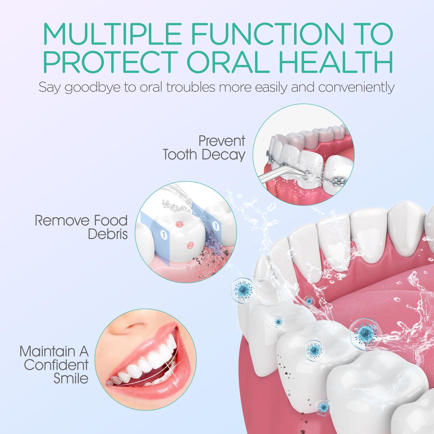 - PERSONALIZED & DEEP CLEANING: This water dental flosser uses 0.6mm water flow with 3 adjustable cleaning modes, which can efficiently remove 99.9% of food debris and plaque, solve common oral problems such as bad breath and bleeding gums, and meet the oral care needs of different groups.