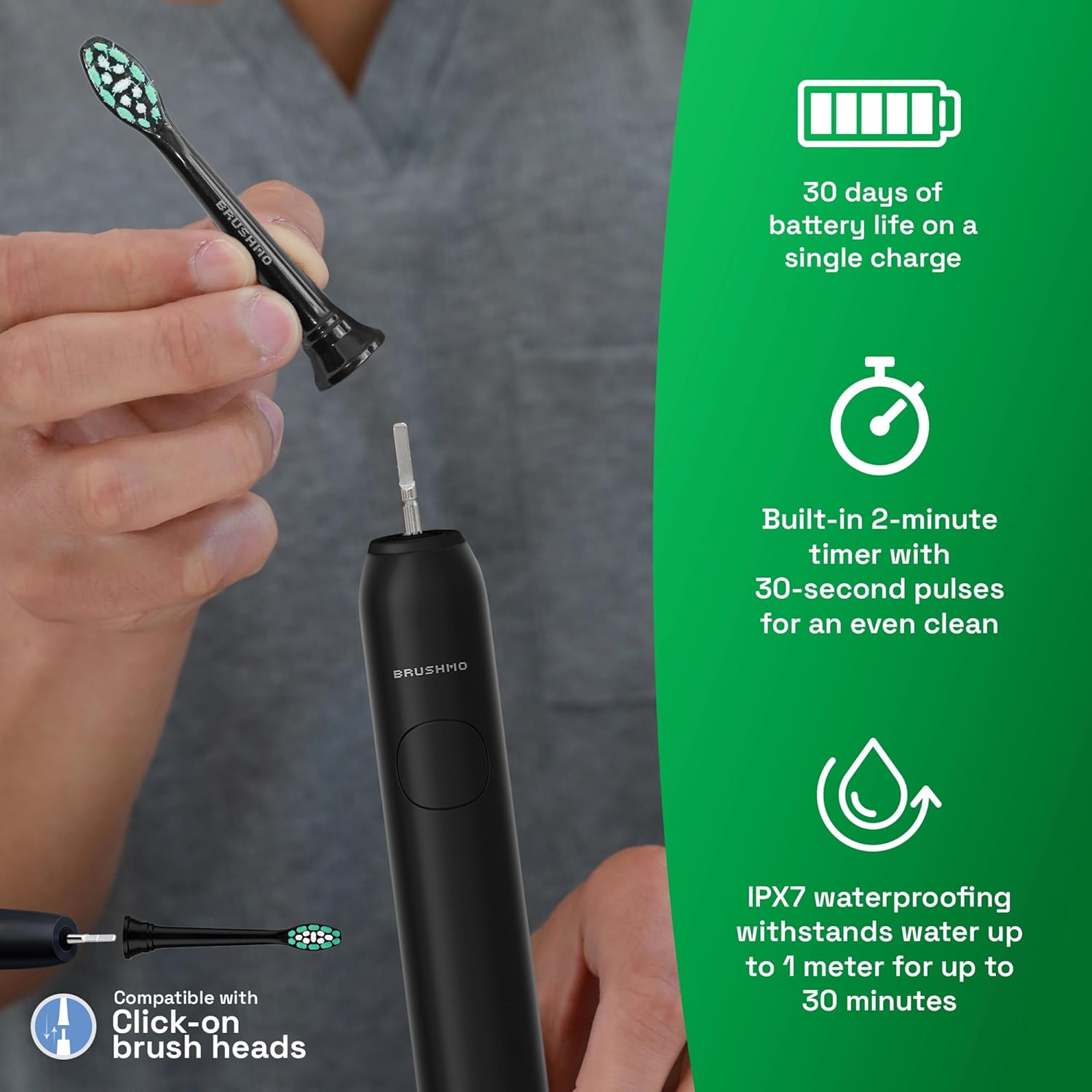 - A Cleaner Smile with Every Brush: Elevate your oral care routine with the Brushmo Super Sonic Toothbrush, delivering a next-level clean. Designed with 5 brushing modes and compatible with most click-on brush heads, it offers a truly personalized brushing experience. Color: Midnight Black.