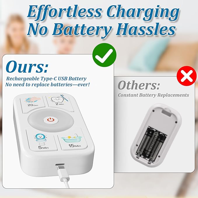 - White Kids Timer: Catchy and appealing to young children, making it a fun addition to their daily routine. The timer features clear, colorful images of handwashing, brushing teeth, using the toilet, and taking a shower, helping children easily identify and engage with each activity