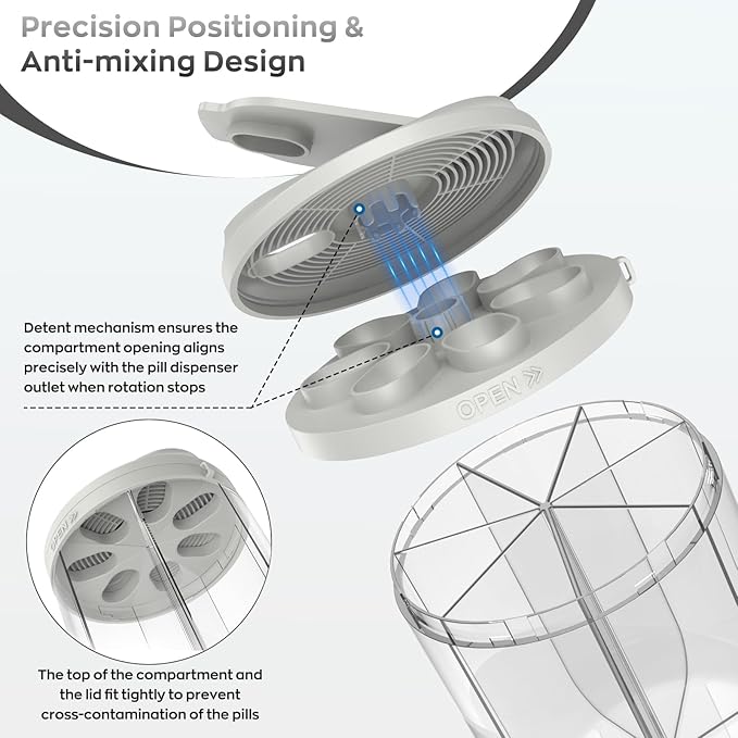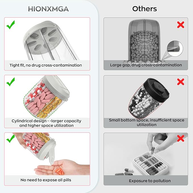 - Easy to use: Hionxmga pill storage box has a flexibly rotating lid and a wide opening, and has exclusive detent mechanism design ensures precise alignment of the compartment opening with the pill dispenser outlet after the rotation is completed. These advantages not only make the loading and taking of pills more convenient and the distribution more accurate, but also avoid the medicine from contacting external contamination. Ensure that each time you take the medicine is efficient and hygienic.
