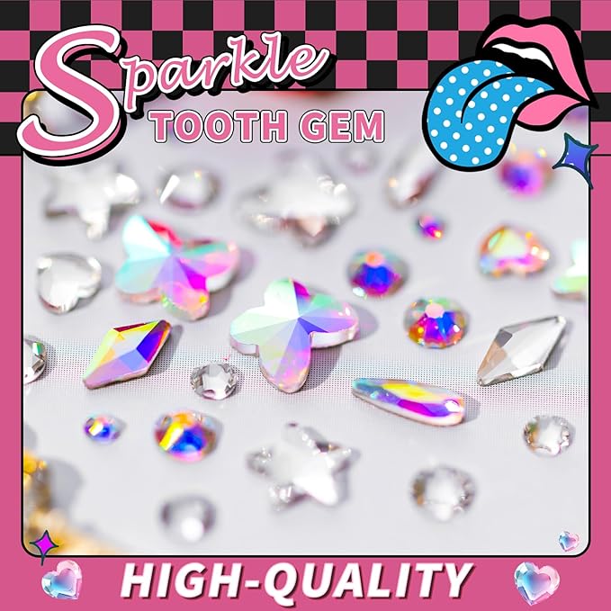 - Teeth gem kit:Teeth gems have 6 special-shaped teeth gems such as butterfly, pentagram, love heart, oval, diamond, a total of 48 tooth gems crystals, there are 154 circular tooth gem jewelry kit of 4 sizes, all teeth gems have two colors of transparent color and AB color, you can DIY many patterns according to different colors and different shapes
