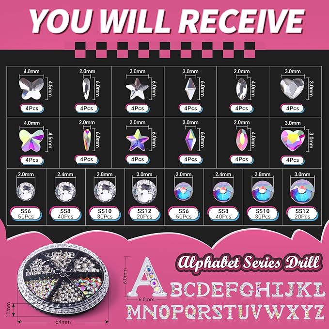 - Golden letters:128 Precious Gems & 26 Alloy Letters - Includes 48 pcs shaped gems (Butterfly, Heart, Star, etc.) + 80 round gems in transparent & AB colors, plus A-Z alloy accessories for endless designs