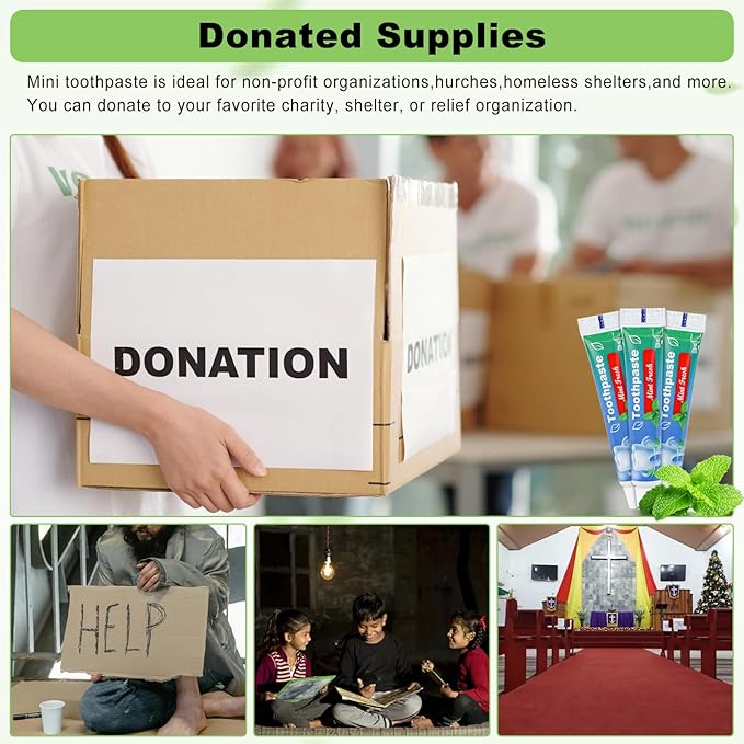 - Donated Supplies:Travel toothpaste bulk is ideal for non-profit organizations, churches, homeless shelters, and more. You can donate to your favorite charity, shelter, or relief organization