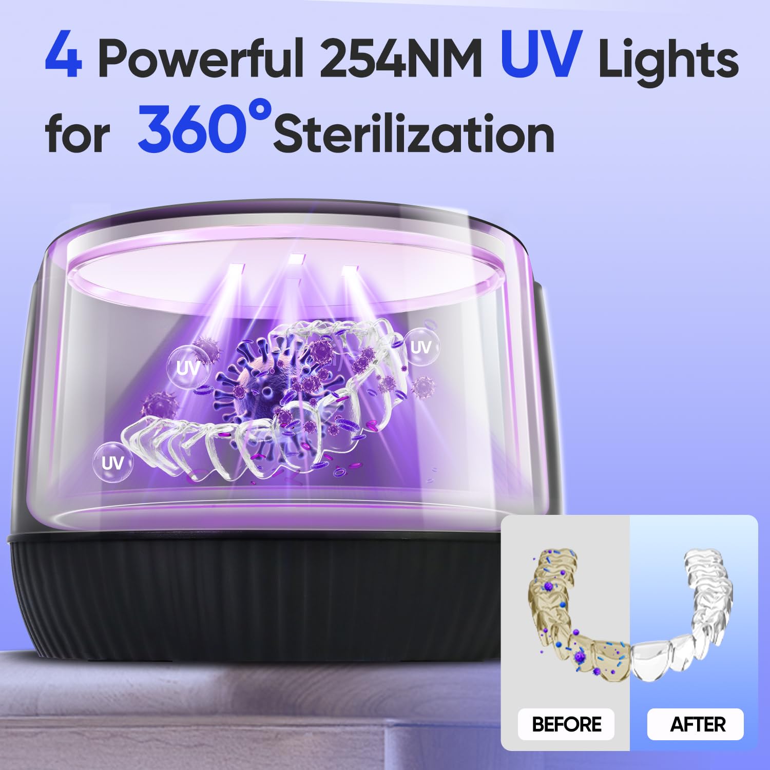- SUPERIOR ULTRASONIC RETAINER CLEANER MACHINE– Experience powerful cleaning with our 24W night mouth guard cleaner and 45,000Hz high-frequency acoustic waves, delivering 360° stain removal from dentures, retainers, braces, and whitening trays. Simply use this ultrasonic aligner cleaner before placing them in your retainer cleaning case to remove surface particles and stains with ease