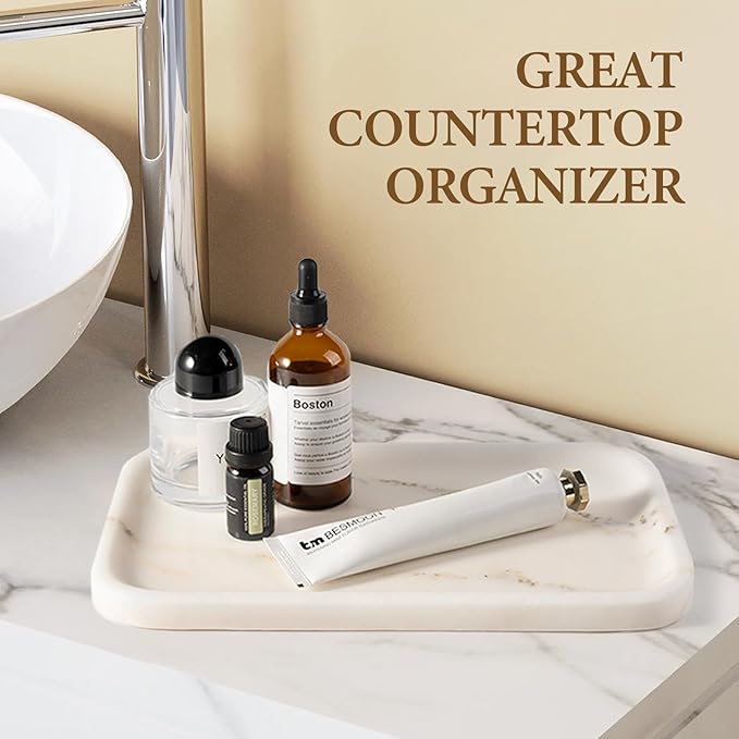 - 【Multi Purpose】This organizer tray can be used as a jewelry tray, perfume tray, cosmetic tray, key watch tray, or even a coffee tray. Whether kitchen, bedroom or living room counter, table or nightstand, this stone vanity tray fits in perfectly. The slightly raised edges of the stone tray can prevent items from falling