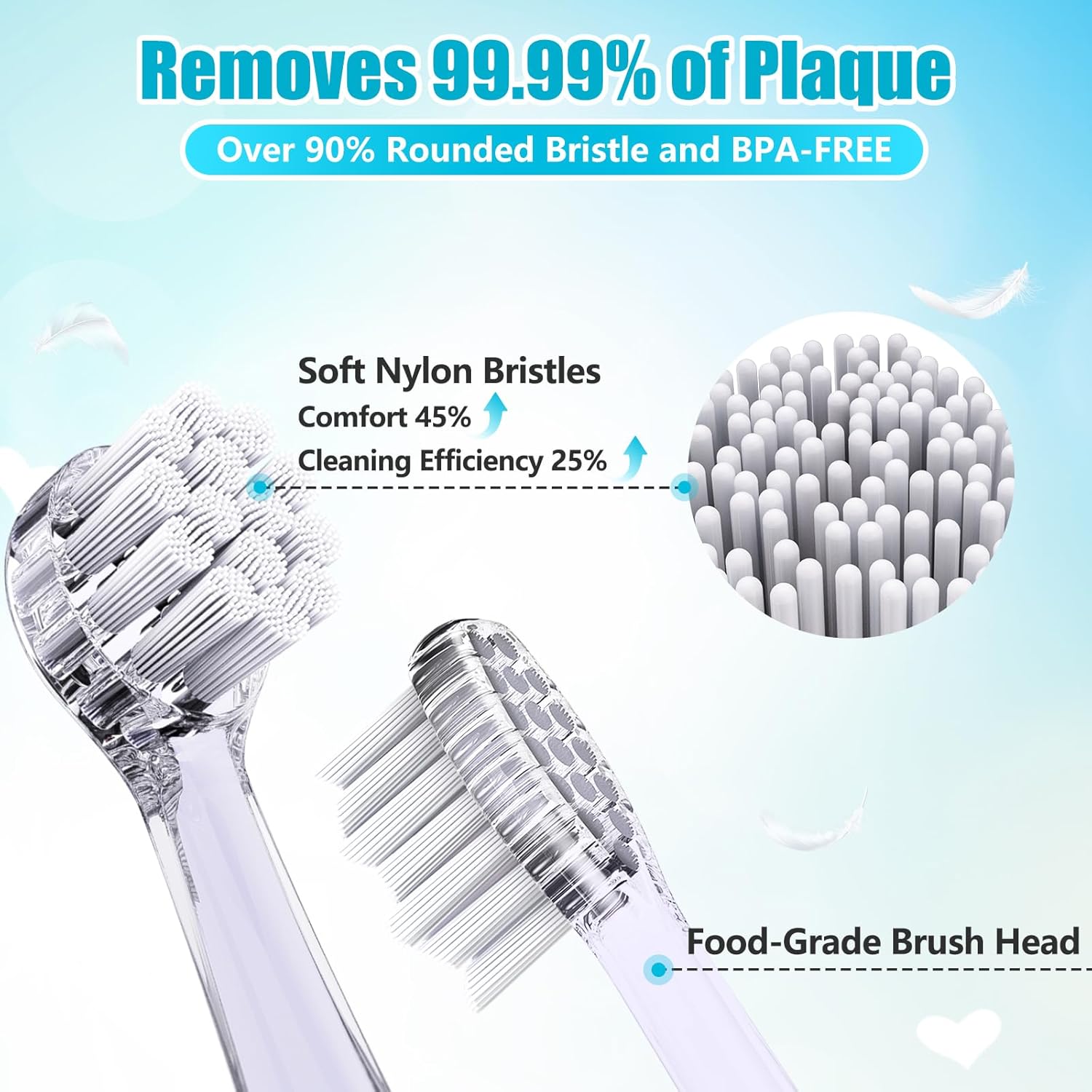 - Toddler Electric Toothbrush Specifically for Kids Aged 0-3: Babies start to sprout their first tooth around six months. This baby electric toothbrush features a soft LED light to help locate food residue and plaque. It is equipped with a 17,000 VPM motor (A+) and bristles with a roundness rate of over 90% (A+), protecting their mouths from cuts. It effectively prevents plaque and cavities caused by milk, with a cleaning efficiency 3.5 times higher than manual toddler toothbrushes.