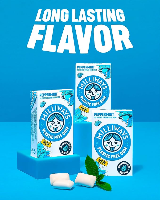 Milliways Peppermint | Plastic Free Gum | Xylitol, Aspartame-Free, Sugar-Free, Plant-Based, Natural Chewing Gum | 120 Pieces Total (12 Packs of 10 Pieces)