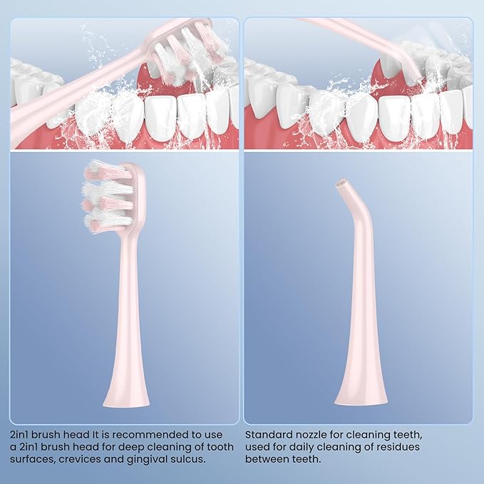 - 【Various accessories】 Package: 1* Device Body, 3* 2 in1 Brush Head, 1* Standard Nozzle, 1* cleaning brush,1* Charging base, 1* Charging Cable, 1* User Manual.The 2-in-1 water flosser package includes a charging base and charging cable. Equipped with a cleaning brush, cleaning is more convenient