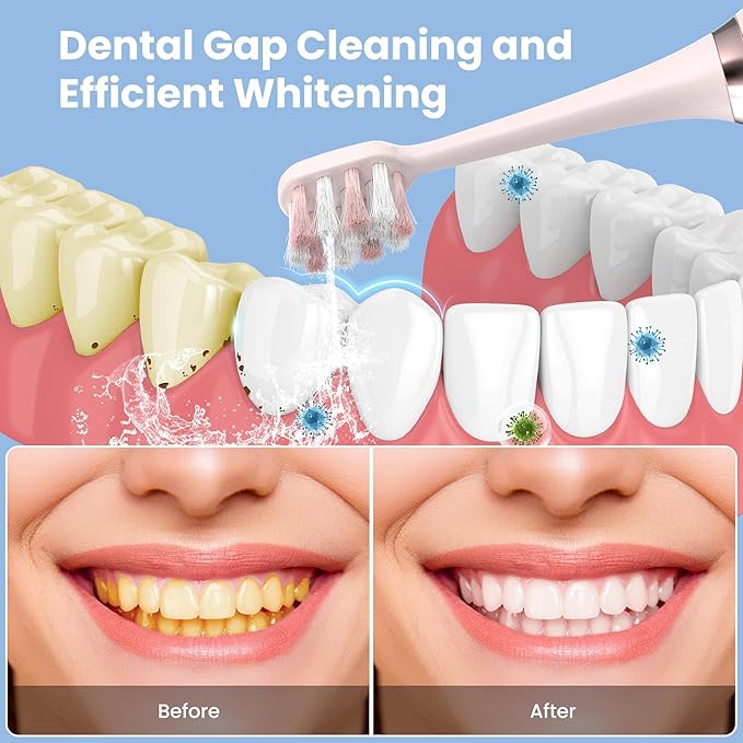 - 【Newly designed brush head】 Our 2 In 1 electric toothbrush has a unique design, The brush head is designed with water outlets, which can spray water while brushing, double-cleaning every corner of your teeth and gums, effectively removing food debris hidden in the depths
