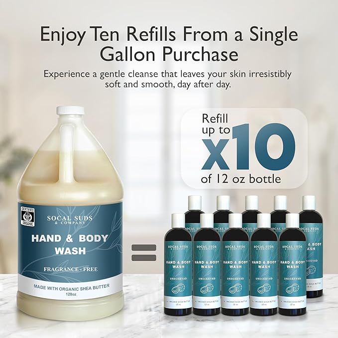 SoCal Suds & Company 128oz Certified Organic Hand & Body Wash w/Shea Butter- Gentle Natural Body,Baby & Face Wash for Sensitive Skin, Moisturizing Thick Castile, Hand Soap and More - Fragrance Free