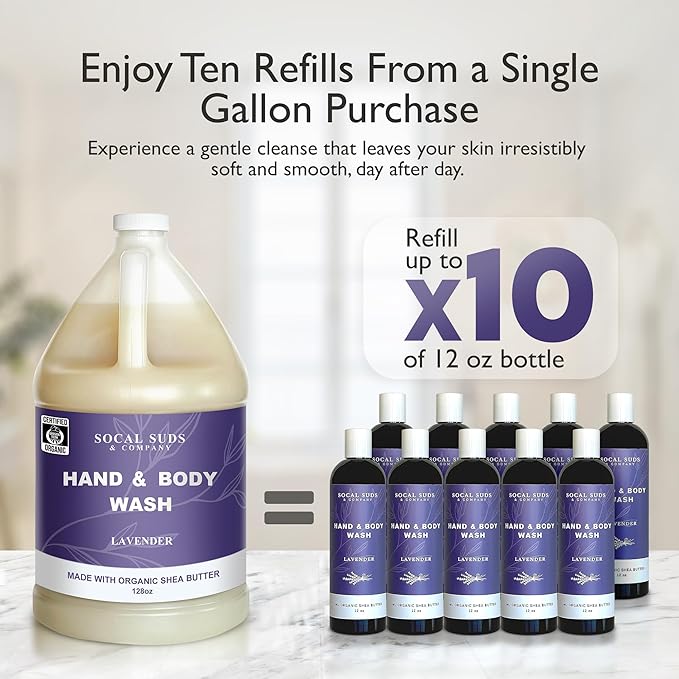 SoCal Suds & Company 128oz Certified Organic Hand & Body Wash w/Shea Butter- Gentle Natural Body,Baby & Face Wash for Sensitive Skin, Moisturizing Thick Castile Soap, Hand Soap and More - Lavender