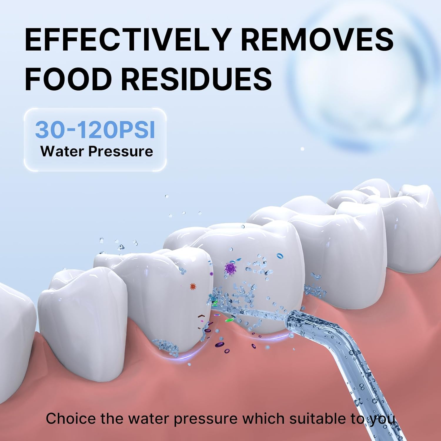 - Deep Teeth Cleaning & Gum Protection: Featuring an ergonomic design and advanced pulsation technology, the portable water dental flosser for teeth delivers 1400-1800 pulses per minute with adjustable water pressure (30-120 PSI). It effectively removes trapped food debris that brushing alone can’t reach, ensuring a deep clean and improved dental health