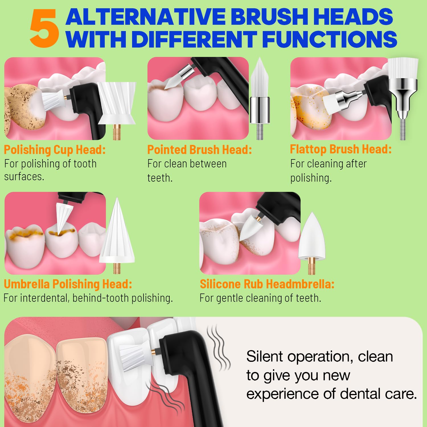 - 5 Brush Heads and 5 Speed Modes: This tooth polishing kit with 5 polishing heads. 1.Polishing Cup: polishing of tooth surfaces. 2.Pointed Brush: deep clean between teeth. 3.Flattop Brush: cleaning material after polishing. 4.Umbrella Polishing: interdental, behind tooth polishing. 5.Silicone Rub Headmbrella: gentle cleaning of teeth. And 5 speed modes, Gentle, Normal, Medium, Strong and Super Strong. The combination allow the teeth polisher to be adapted to various oral conditions