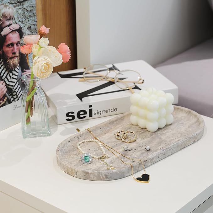 Koville Natural Travertine Tray for Bathroom Countertop, 12"x6" Vanity Decorative Marble Tray for Perfume, Candles, Jewelry, Stone Catchall Trays Jewelry Dish, Silver Stone Trays for Kitchen Counter