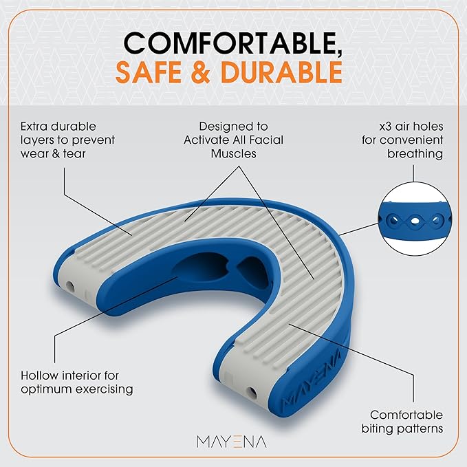 - THE FULL-FACE ACTIVATOR: Innovated by Mayena, product innovations include 1) Design: arc shape to activate all facial muscles during the exercises 2) Safety: Extended teeth guards to eliminate any choking hazard 3) Durability: Hard shell silicone to prevent teeth penetration and premature wear and tear. 4) Comfort: adjusted to fit any mouth size.