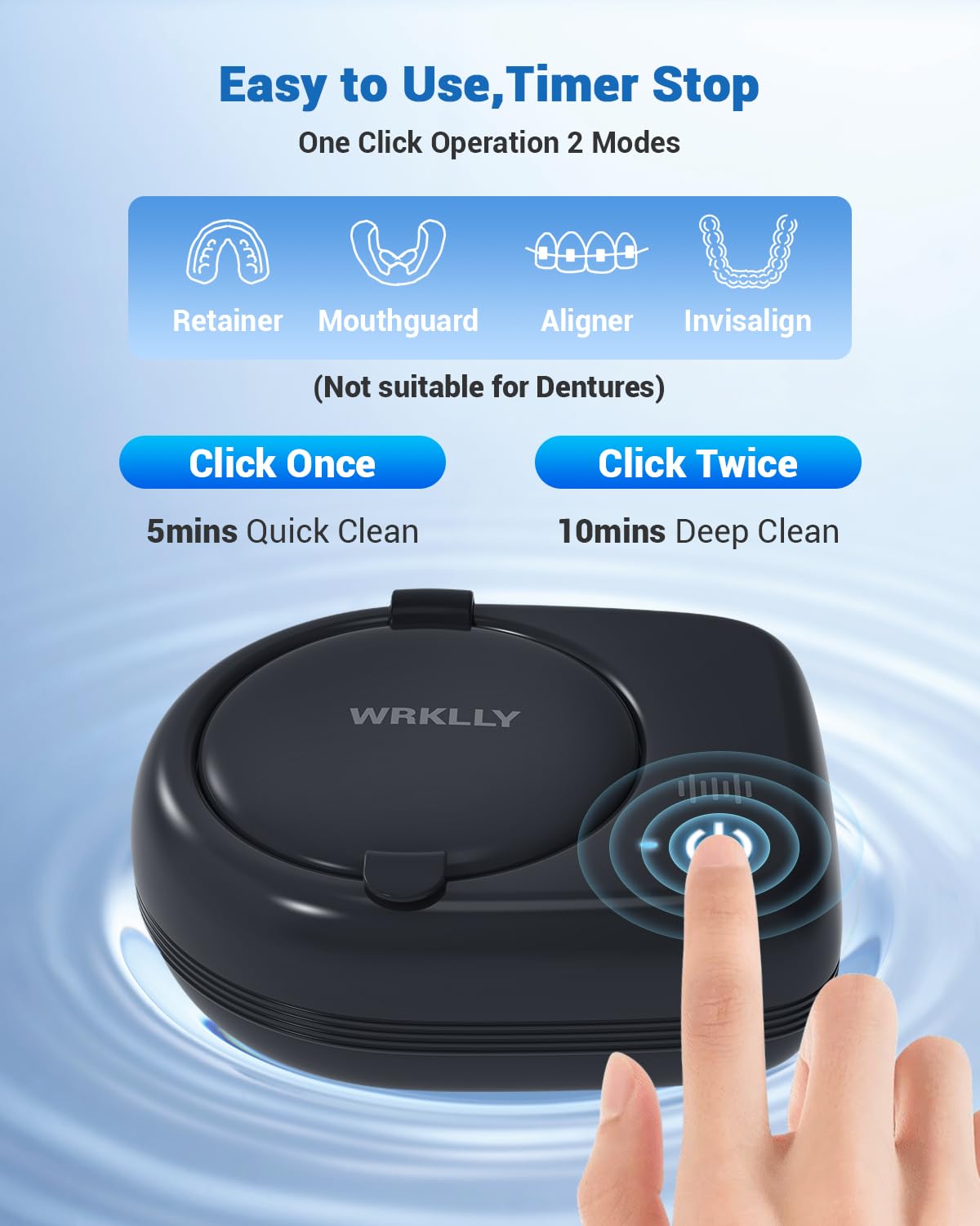 - Simple One-Touch Operation: The ultrasonic cleaner for retainers is activated with just a single tap. You can easily switch between two operating modes of 5 min and 10 min with a quick press of a button.The ultrasonic cleaner retainer features an automatic shut-off function to prevent over-cleaning and potential damage to your retainer. Crafted from high-quality ABS and SUS304 stainless steel,resist corrosion and ensure longevity,It features IPX5 waterproofing and non-slip rubber feet for stability ,The upgraded night guard cleaner ultrasonic runs at just 40dB, ensuring a quieter experience