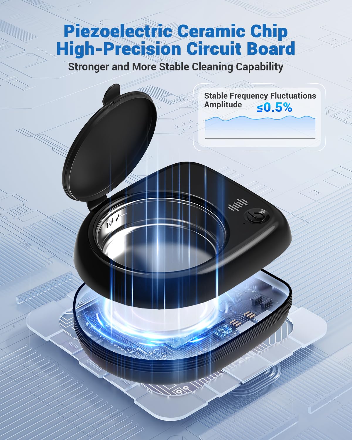 - Premium Brand Components & Reliable Performance: Our retainer ultrasonic cleaner Powered by Piezoelectric Ceramic Chip & High-Precision Circuit Board,These high-quality components increase cleaning power by 50%.piezoelectric ceramic discs provide higher conversion efficiency, ensuring stable output of ultrasonic frequency, High-Precision Circuit Board precisely control frequency and power, stabilizing machine performance and extending the ultrasonic retainer cleaner machine’s lifespan for increased durability,delivering consistent cleaning power from the first to the 1,0000th use