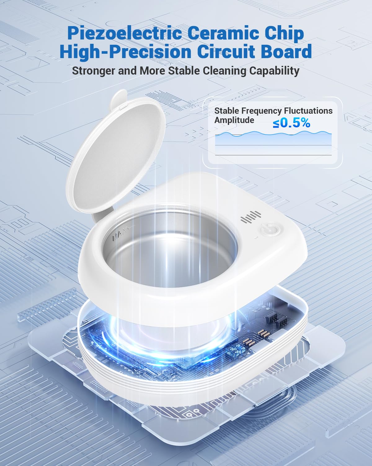 - Premium Brand Components & Reliable Performance: Our retainer ultrasonic cleaner Powered by Piezoelectric Ceramic Chip & High-Precision Circuit Board,These high-quality components increase cleaning power by 50%.piezoelectric ceramic discs provide higher conversion efficiency, ensuring stable output of ultrasonic frequency, High-Precision Circuit Board precisely control frequency and power, stabilizing machine performance and extending the ultrasonic retainer cleaner machine’s lifespan for increased durability,delivering consistent cleaning power from the first to the 1,0000th use