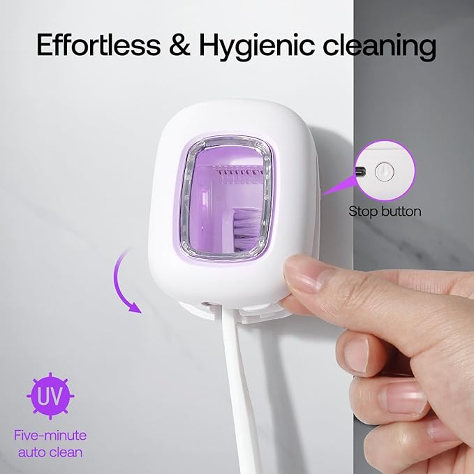 - Effortless and Hygienic Cleaning: Place your toothbrush in the smart holder, close the cover to initiate automatic cleaning. The 5-minute cycle stops automatically when the cover is opened. For immediate closure, simply press the adjacent switch button.