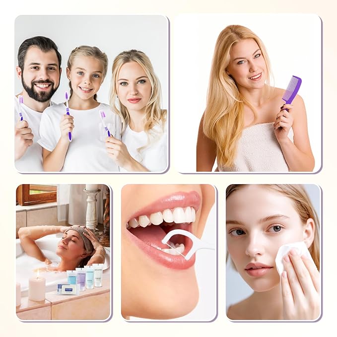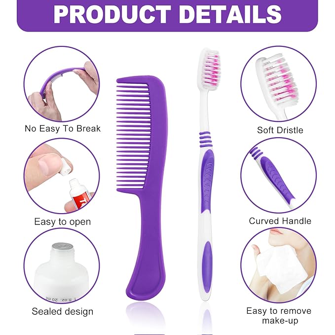 - 13-IN-1 Hygiene Supplies: Each travel size hygiene kit includes 1*Toothbrush, 1*toothpaste, 1* comb, 1*bath gel, 1*shampoo, 1*conditioner, 1*body lotion, 1*soap, 1*bath cap, 1*vantity kit (2*cotton pads, 4*cotton swabs ,1*floss), 1*makeup remover wipe, 1*body wipe, 1*zipper bag. Each set packed in a sealable bag for hygiene.