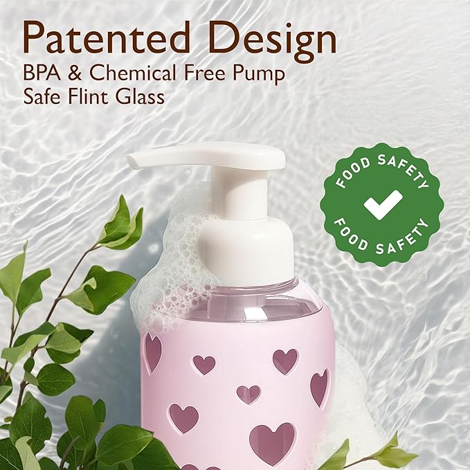 SoCal Suds & Company Glass Foaming Hand Soap Dispenser, Heart Silicone Sleeve, Refillable Pump Bottle for Kids, Baby Wash & Shampoo, Ideal for Home Use, Soft Pink 8oz