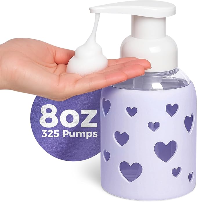 SoCal Suds & Company Glass Foaming Hand Soap Dispenser, Heart Silicone Sleeve, Refillable Pump Bottle for Kids, Baby Wash & Shampoo, Ideal for Home Use, Soft Purple 8oz