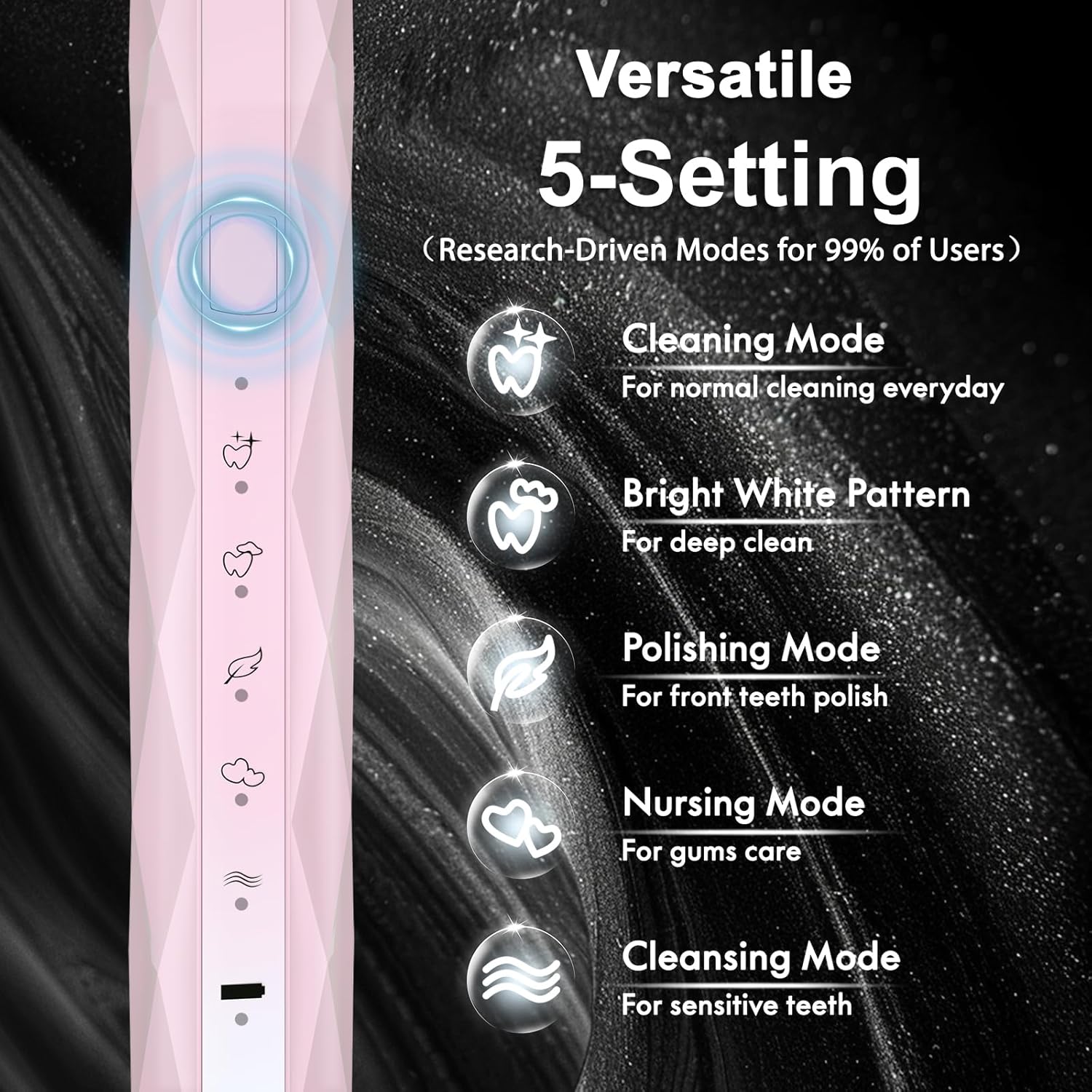 - Personalized Oral Care: This electric toothbrush offers 5 customizable cleaning modes - Clean, White, Massage, Sensitive, and Tongue Cleaner - designed to cater to your unique oral hygiene needs, allowing you to precisely target areas of concern for optimal oral health.