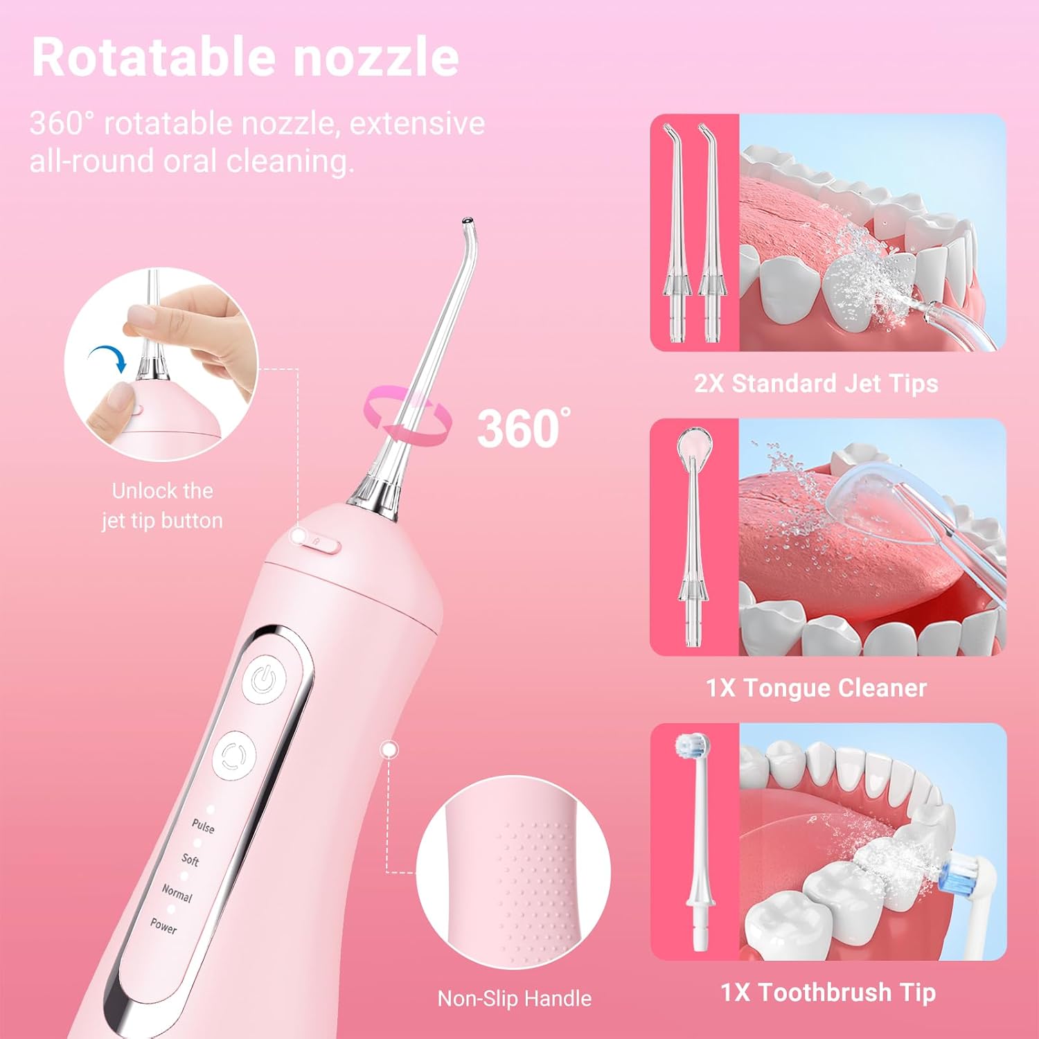 Cordless Water Dental Flosser Oral irrigator,JNGOODS 300ml Rechargeable Water flosser for Teeth IPX7 Waterproof 4 Modes Portable Oral Irrigator with 4 Jet Tips, Travel Home use (Pink)