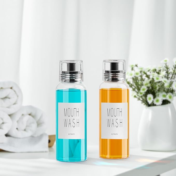 - 【Borosilicate Glass Bottle】Our mouthwash dispensers are made of clear borosilicate glass, which is sturdy, practical, reusable, and wide mouth for easy to fill with mouthwash. The cute and elegant appearance of the mouthwash bottle adds some beauty to your bathroom.