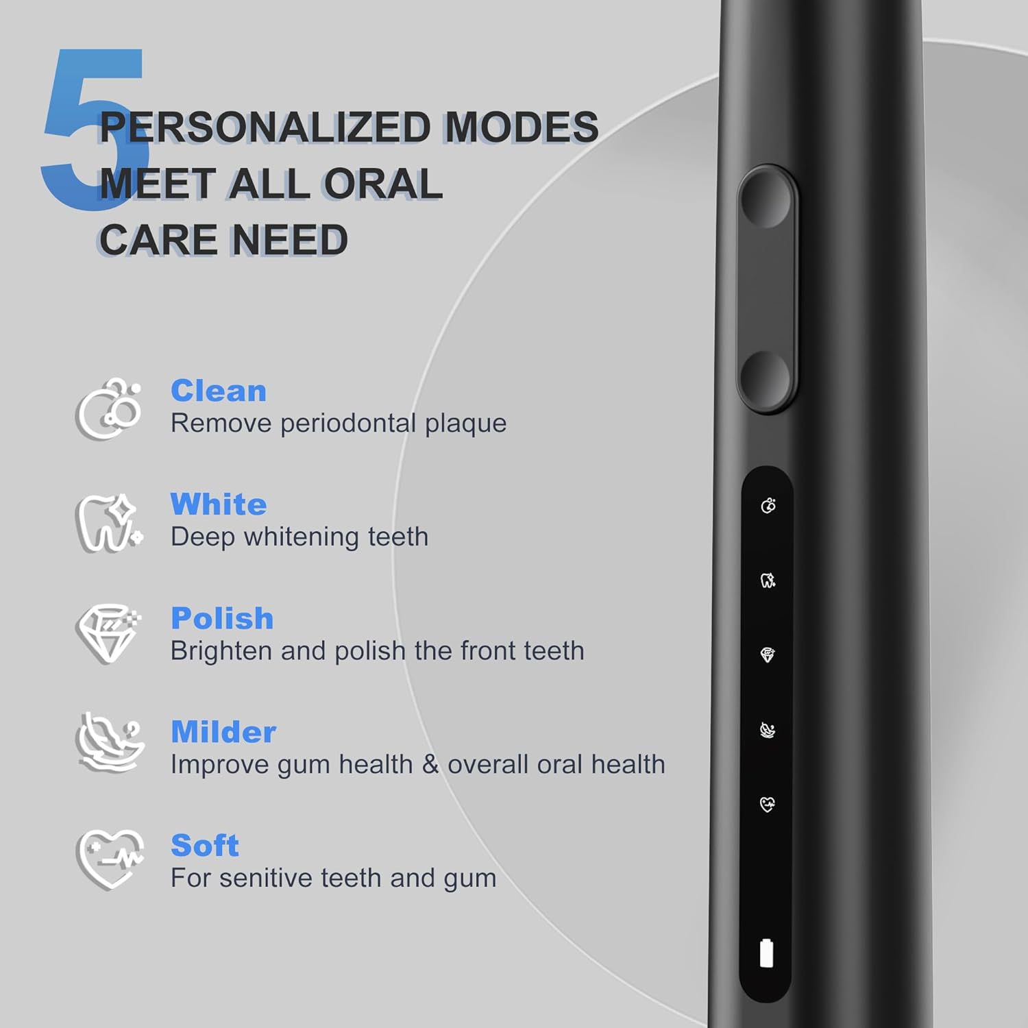 - 5 Clean Modes - Electric toothbrush with 5 modes for adults and kids. Clean(gentle), White(strong), Polish(strong invert frequency), Milder(gentle invert frequency) and Sensitive(soft) to suit different conditions of teeth of gums, so you can choose different modes according to your preferences and dentist's recommendations.