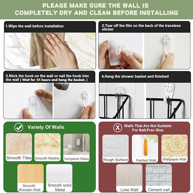 - 【Easy Installation】The shower caddy comes with adhesive hooks and traceless hooks. Simply stick or nail the hook to a dry and clean wall, press out the air, and wait for a few hours. Then, you can start storing your bath toys in these bathroom accessory.