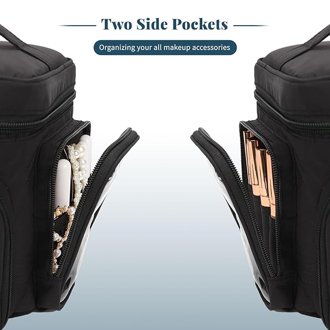 - Separate Makeup Brush Compartments - The makeup bag organizer top lid features a makeup brush compartment for multiple makeup brushes of different sizes, extra velcro PVC cover to protects the organization from powder dust and easy to clean make-up stains!