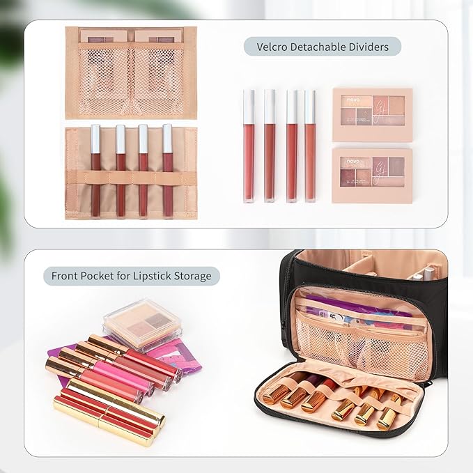 - Multiple Pockets & Versatile Design - The travel makeup bag is designed with a large front pocket with 6 lipstick pouches and 2 mesh pockets 1 large PVC pocket, as well as 2 side pockets for storing all travel-size toiletries, cosmetics and accessories, etc.