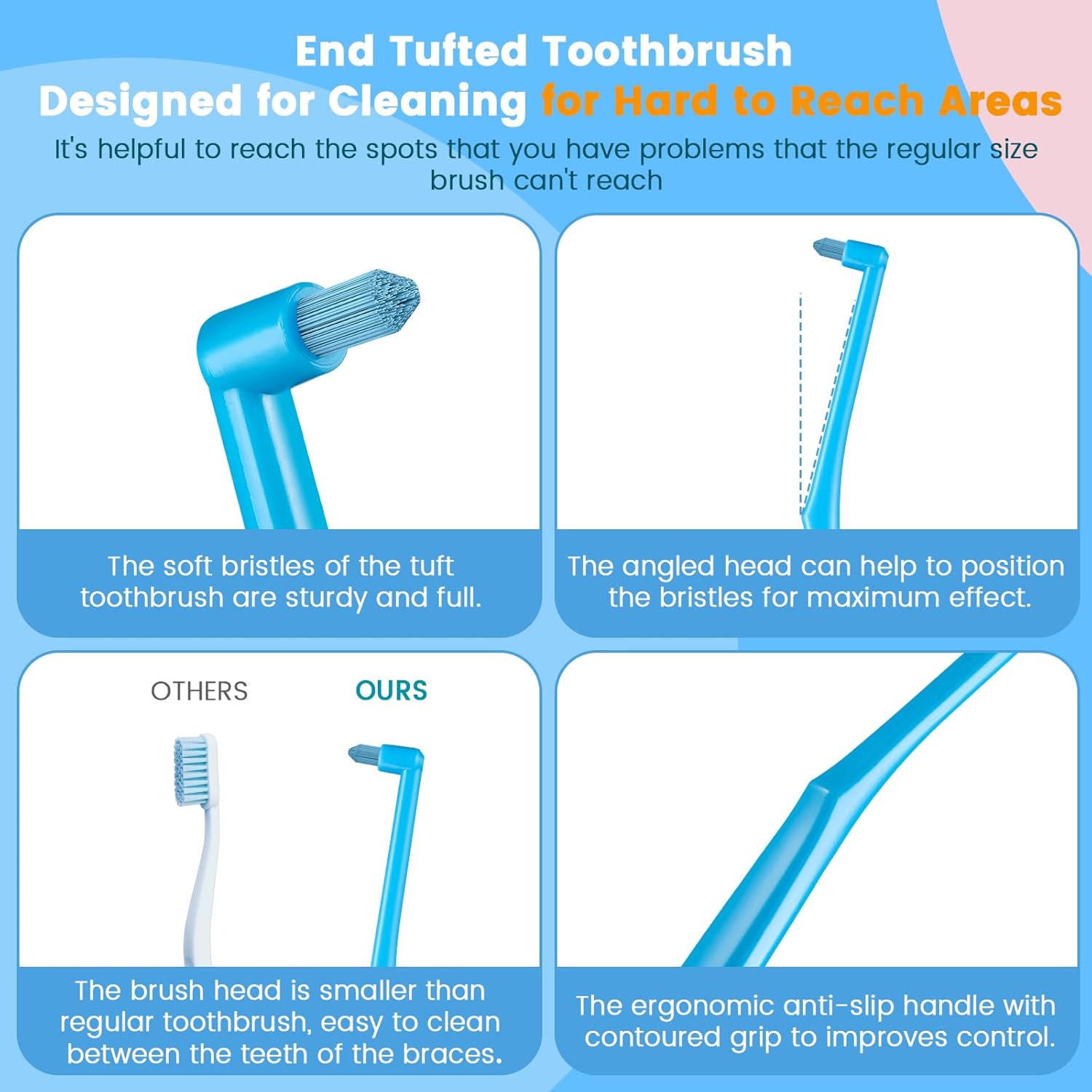 - Ergonomic Anti-Slip Handle: The end tuft toothbrush adult with contoured grip to improves control. It's comfortable to maneuver to the back of the mouth. The soft bristle toobrush can remove stains effectively and gentle on gums.