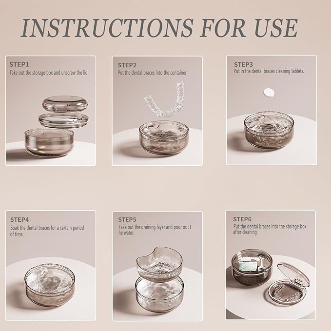 - Portable: The Soaking box cover is to connect the upper and lower parts, facilitating the overall carrying. (Through the magnetic attraction function.) Note:After soaking your retainer with the cleaning tablet and screwing on the soaking box cover, don't shake it (better not to screw on the Soaking box cover). Gas will flow out along with water because the cleaning tablet will generate a large amount of gas. If you don't put in the cleaning tablet and screw on the soaking box cover tightly, there will be no water leakage.