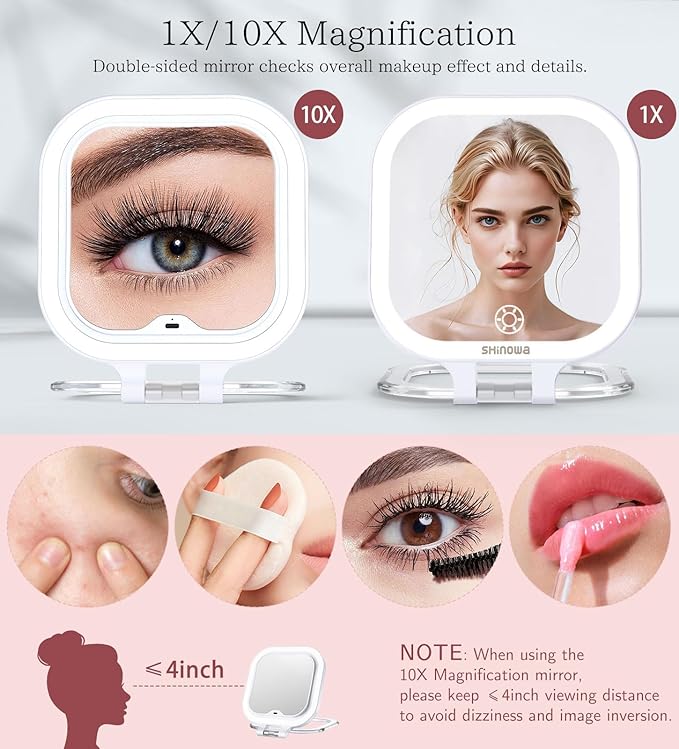 - 10X/1X Magnification Mirror: This travel makeup mirror features a double-sided design with 1X and 10X magnification. The 1X side is suitable for overall makeup and daily skincare. The 10X side zooms out your makeup details when applying eyeliner, mascara, or grooming eyebrows for a flawless and delicate makeup look. NOTE: When using the 10x magnifying mirror, please keep the mirror ≤ 4 inches or closer to your face.