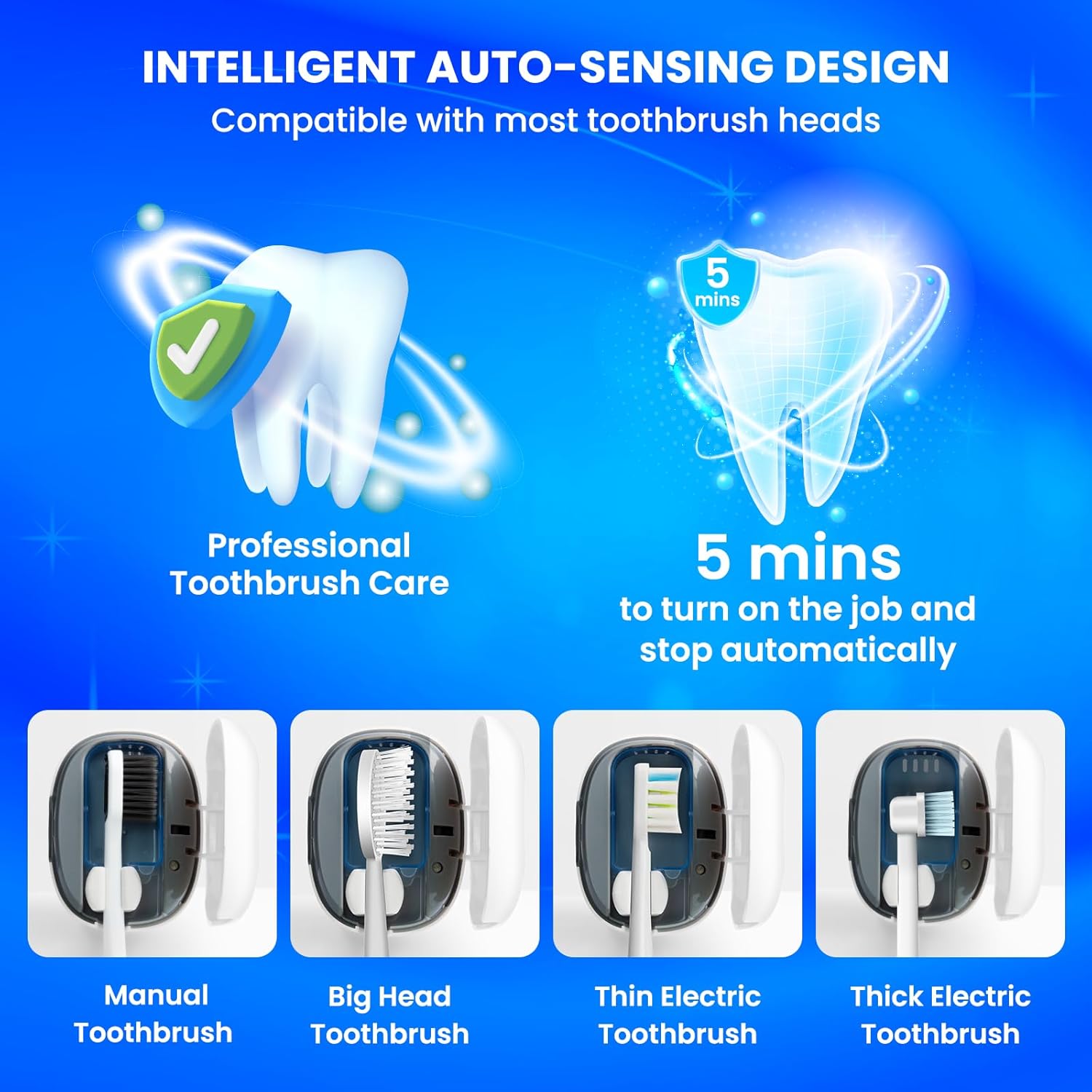 - ๐๐ง๐ญ๐๐ฅ๐ฅ๐ข๐ ๐๐ง๐ญ & ๐๐จ๐ง๐ฏ๐๐ง๐ข๐๐ง๐ญ: The intelligent portable mini toothbrush case is designed with a fully automatic sensor that locks securely and closes automatically, works automatically for 5 minutes each time the lid is pressed, and the toothbrush travel case has a removable inner case that can be removed and rinsed for convenience. It also comes with a stand that makes it easy to place on a bathroom shelf or over the sink, making it very convenient.