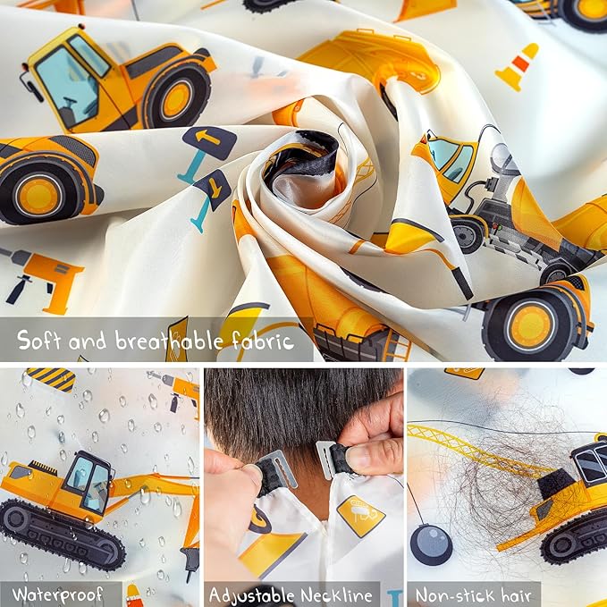 - HAIR CUTTING MADE FUN : Our barber cape for kids features adorable construction site patterns to make haircuts enjoyable for both boys and girls.Crafted from waterproof polyester fabric, our hair cut capes for kids are anti-wrinkle, anti-static, and machine-washable for long-lasting use.