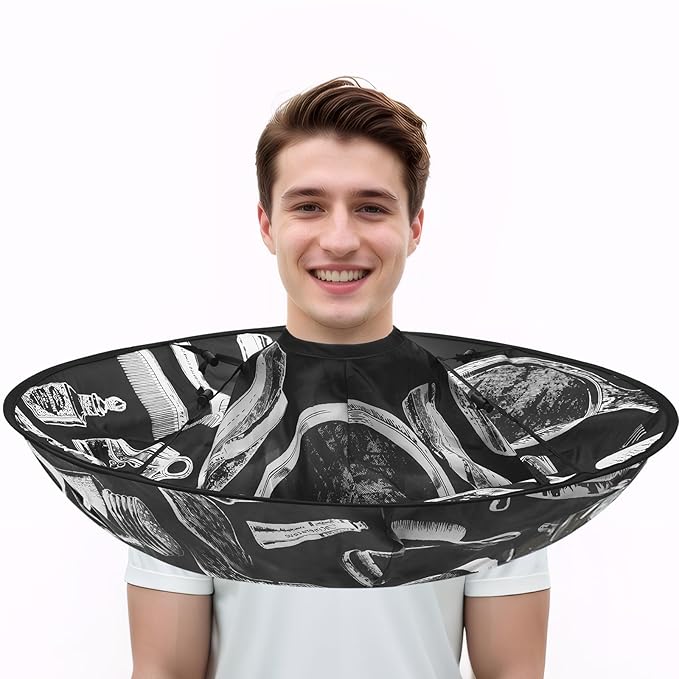 FEBSNOW Hair Cutting Cloak Cape, Black Prints Adjustable Haircut Cape Foldable Umbrella for Adults Kids Home Salon Barber Supplies