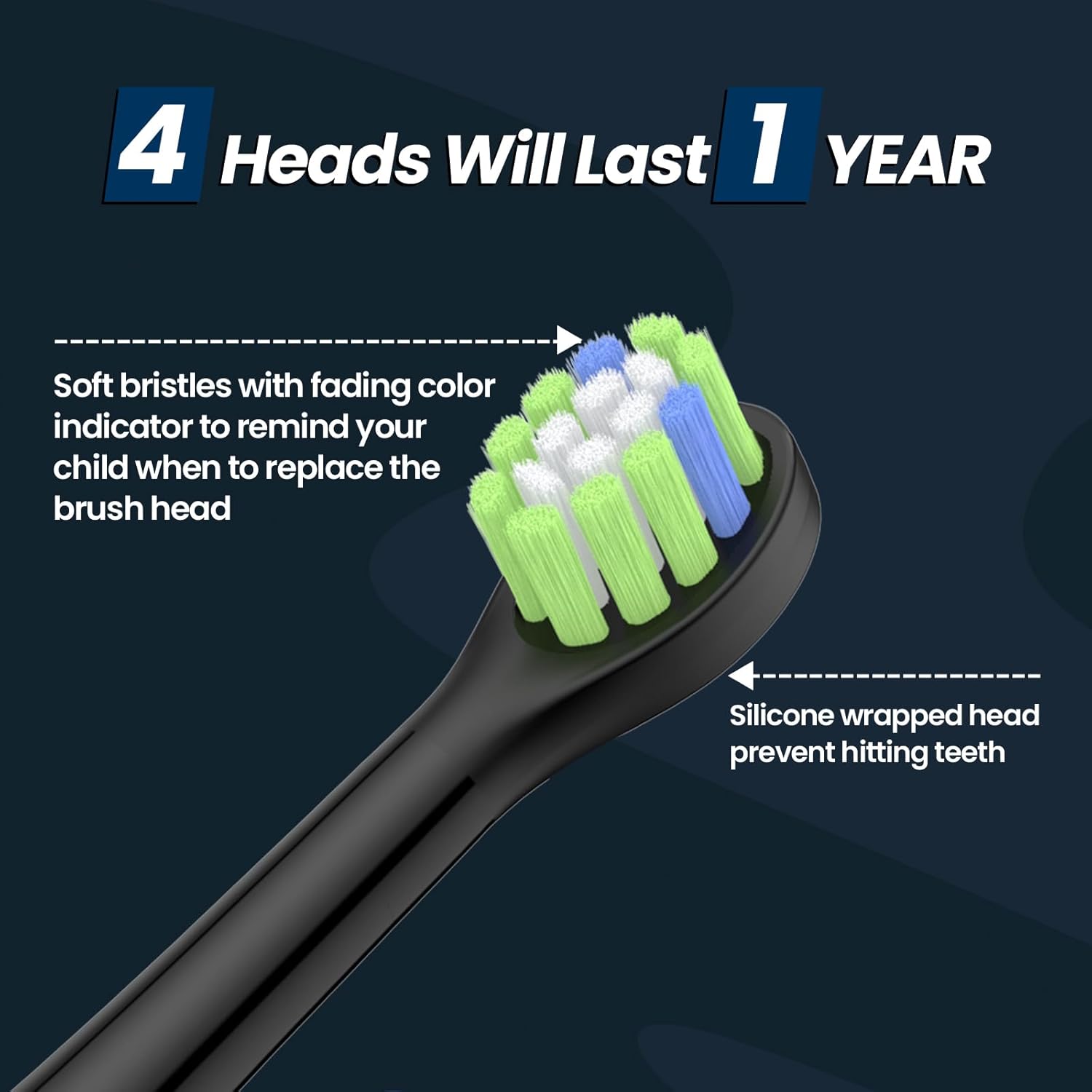 - Long-lasting Performance - The kids rechargeable electric toothbrush includes 4 replaceable brush heads, blue faded bristles as a reminder for timely head replacement, and a rechargeable battery with a up to 60-day lifespan based on 4 minutes of daily use, ensuring sustained and reliable performance. With a Type-C charging cable for quick recharging and an IPX7 waterproof rating for easy cleaning, our electric toothbrush for kids is designed to make oral care enjoyable and effective for your child.