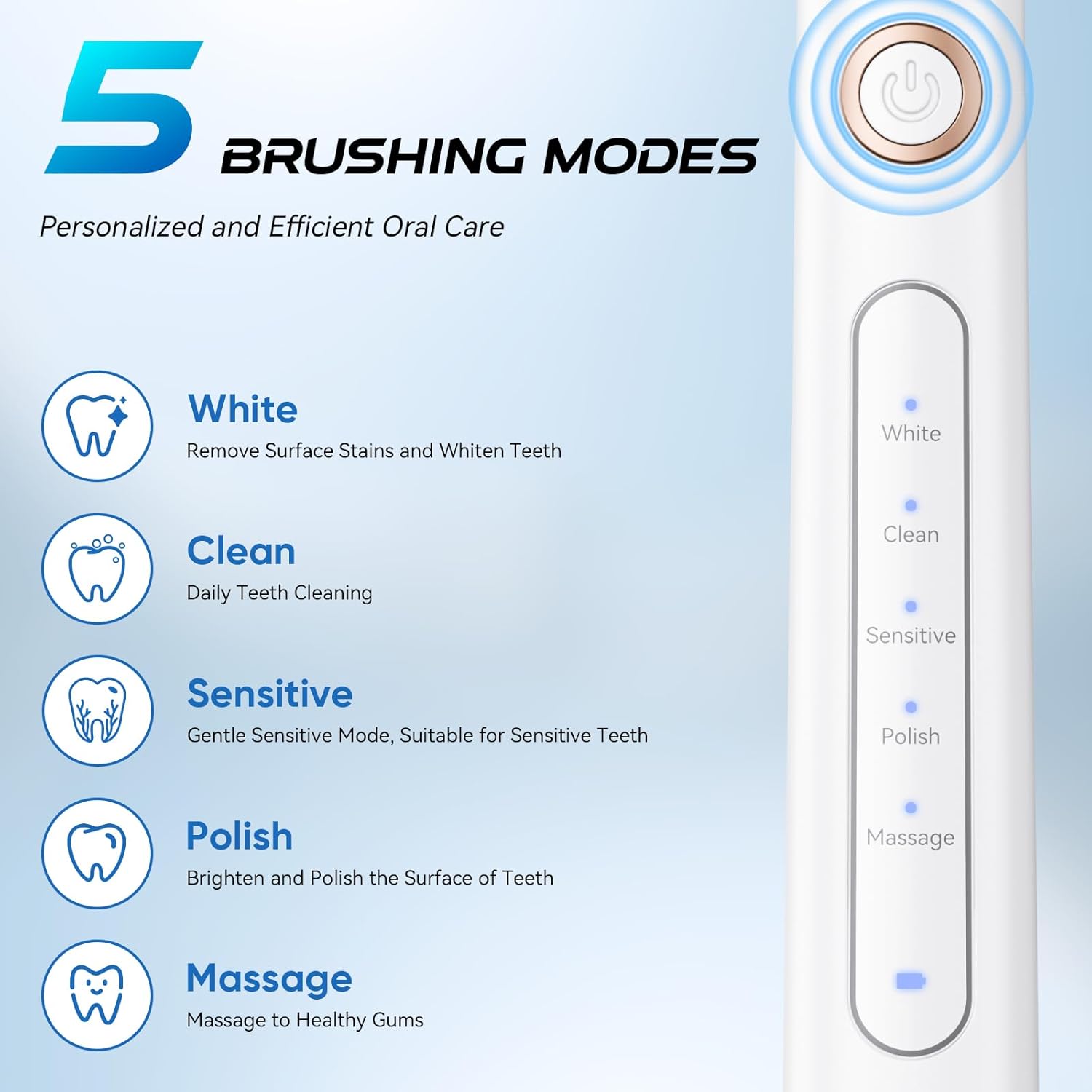 - 【5 Optional Modes for a Personalized Clean】 This sonic white electric toothbrush features 5 customized modes—White, Clean, Soft, Polish, and Gum Care—to suit every oral care need. Whether you're targeting plaque removal, gum sensitivity, or need an electric toothbrush for braces, this brush adapts to your unique dental condition.
