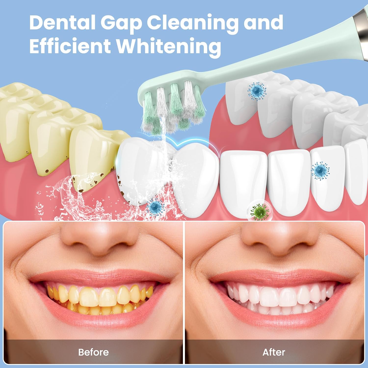 - 【Newly designed brush head】Our 2 In 1 electric toothbrush has a unique design, The brush head is designed with water outlets, which can spray water while brushing, double-cleaning every corner of your teeth and gums, effectively removing food debris hidden in the depths