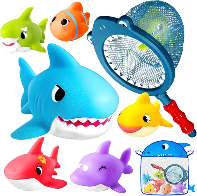 - SPARK IMAGINATION & developing motor skills UNDERWATER! Watch your little explorer come alive! Scooping & catching the sealed bath toys builds crucial hand-eye coordination and develops fine motor skills. Naming the shark family boosts early language development. Create endless underwater stories. The adorable shark net is irresistible!