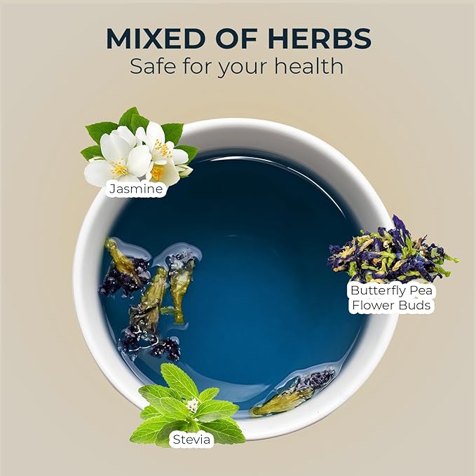 - š[NEW TEA SAMPLERS] The 10 tea bags version is ready for newbies. Enjoy the vibrant taste of butterfly pea flower mixed with jasmine's soothing aroma and stevia's natural sweetness. This tea offers a refreshing and calming experience in every cup.