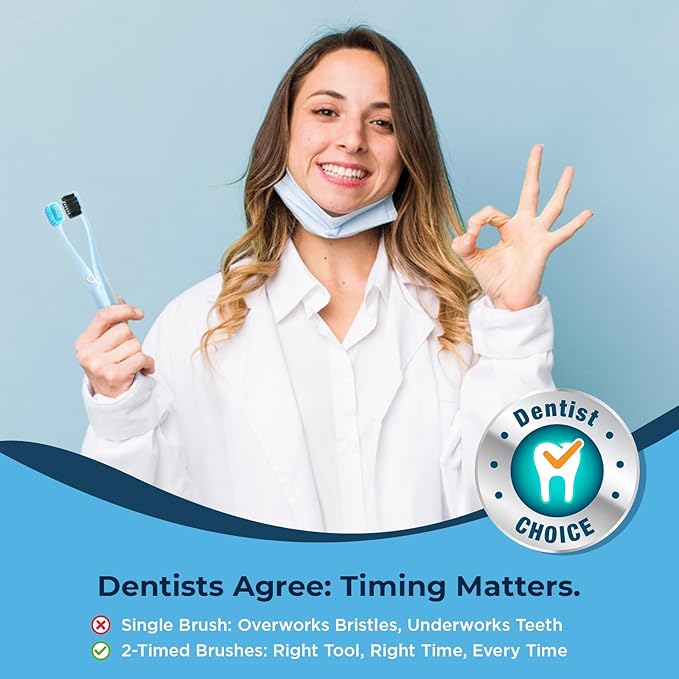 - Hygienic 6-Pack with Individual Packaging: This timed toothbrush set includes 3 morning freshness toothbrushes, 3 nighttime toothbrushes(colors may vary), perfect for complete daily oral care. Smart Icon Coding: Sun= AM, Moon = PM—never mix up routines again. For better results, replace every 3 months and pair with our aluminum toothbrush case for organized storage!